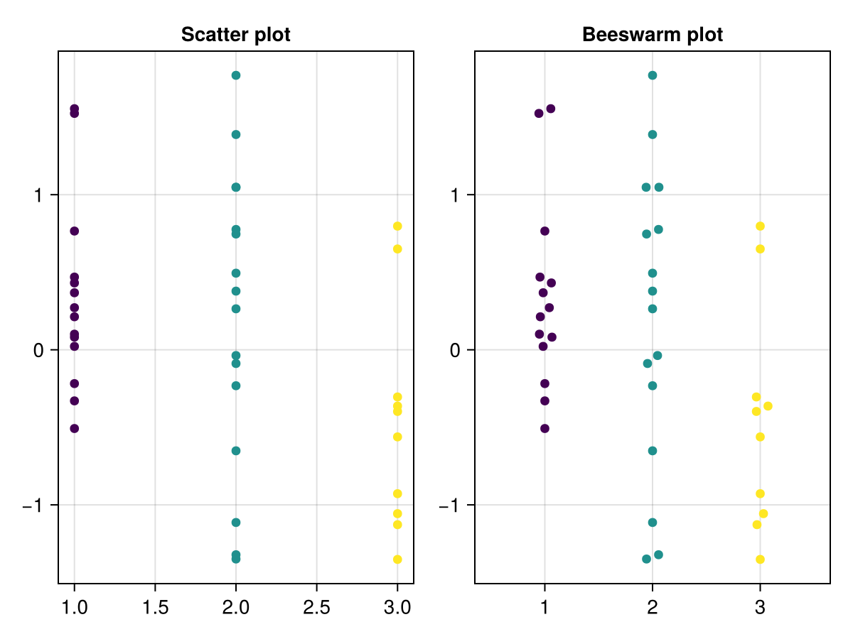 beeswarm(f[1, 2], xs, ys; color = xs, algorithm = SimpleBeeswarm(), axis = (; title = "Beeswarm plot"))