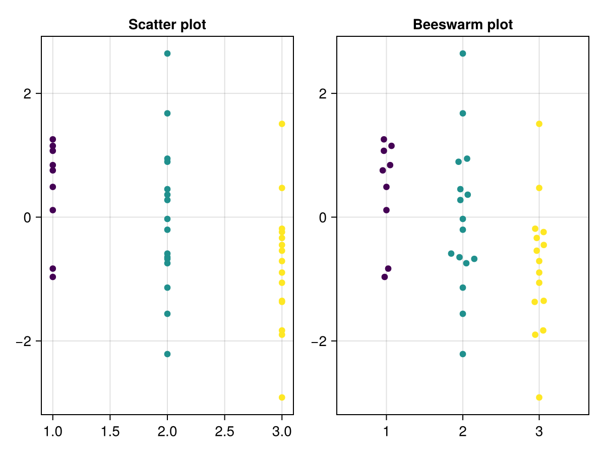 beeswarm(f[1, 2], xs, ys; color = xs, algorithm = SimpleBeeswarm(), axis = (; title = "Beeswarm plot"))